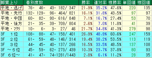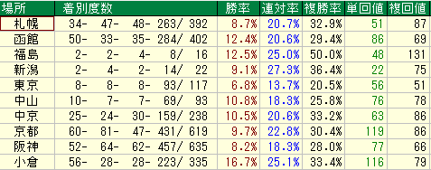 勝率 12.1% / 複勝率 25.9% / 単勝回収値 56 / 複勝回収値 55 複勝率が25.9%と低く、かつ回収率も単複ともに50台。人気でも穴でも馬券圏内に持ってくる確率が平均的に低く、妙味はほとんどありません。