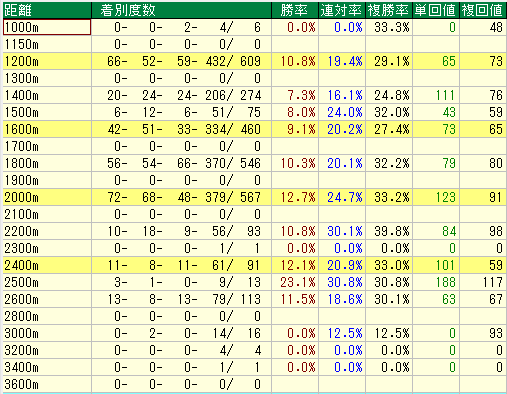 • ブロガー解説: 複勝率は32.0%と高めに見えますが、回収値が単複ともに壊滅的です。「人気馬で掲示板には乗るが、配当的には全く美味しくない」という、馬券購入者泣かせの距離設定になっています。