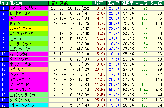 複勝率 26.5% / 単勝回収値 120 / 複勝回収値 70 こちらも的中率よりは単勝回収値が光ります。キタサンブラックの父としても知られる本血統において、粘り強さを引き出し、単勝100超えの利益を届けてくれます。